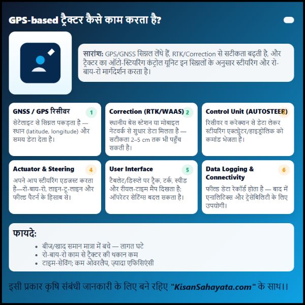 GPS-based ट्रैक्टर में एक GPS रिसीवर, कंट्रोल यूनिट और कभी-कभी ऑटो-स्टेयरिंग सिस्टम लगा होता है। ये रिसीवर सैटेलाइट से सिग्नल पकड़कर ट्रैक्टर की सटीक लोकेशन पता करता है। फिर कंट्रोल यूनिट उस डेटा को प्रोसेस करके ड्राइवर को स्क्रीन पर दिखाती है या ऑटो-स्टेयरिंग को कंट्रोल देती है। इससे फायदा ये होता है कि