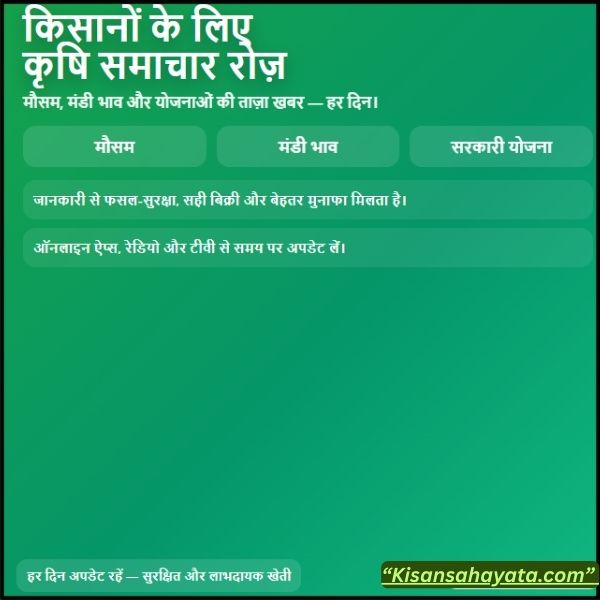 किसानों के लिए खेती एक आजीविका ही नहीं बल्कि जीवन का आधार है। इसलिए यह जरूरी है कि वे रोज़ाना खेती से जुड़ी खबरों से अपडेट रहें। चाहे वह मौसम की चेतावनी हो, बाजार भाव की जानकारी हो, सरकारी योजना की घोषणा हो या नई तकनीक का अपडेट—इन सबका सीधा असर किसान की आमदनी और जीवन पर पड़ता है। यही वजह है कि किसानों को प्रतिदिन कृषि समाचार क्यों जानना चाहिए? का जवाब यही है कि यह उनके जीवन को सुरक्षित, आधुनिक और लाभकारी बनाता है।