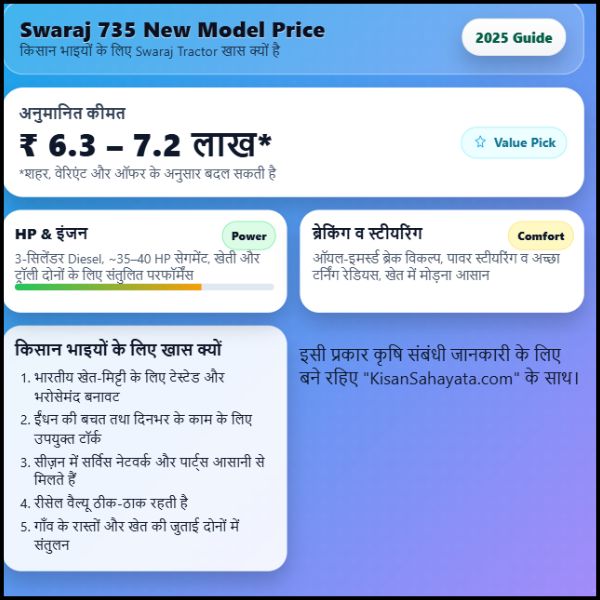नमस्कार किसान भाइयों स्वराज 735 न्यू मॉडल प्राइस क्या है। जब बात आती है खेती-बाड़ी के काम की, तो एक किसान सबसे पहले जिस चीज़ पर भरोसा करता है, वो है उसका ट्रैक्टर। और अगर ट्रैक्टर की दुनिया में भरोसे की बात करें, तो Swaraj 735 का नाम सबसे ऊपर आता है। Swaraj 735 New Model Price | किसान भाइयों के लिए Swaraj Tractor खास क्यों है। सालों से यह मॉडल किसान भाइयों की पहली पसंद बना हुआ है, और अब इसका Swaraj 735 FE New Model मार्केट में अपनी दमदार परफॉर्मेंस और किफायती कीमत के साथ छाया हुआ है।