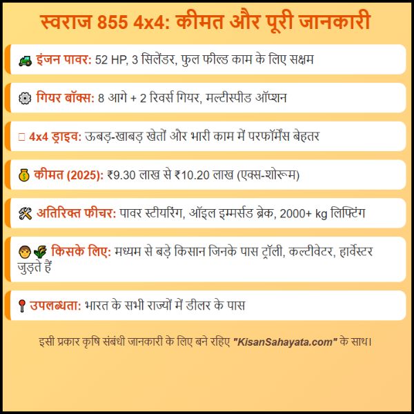 बल्कि इसकी कीमत और फीचर्स भी दिल जीत लेते हैं। लेकिन असली सवाल ये उठता है। Swaraj 855 4×4 की कीमत क्या है? और क्या ये ट्रैक्टर हमारी खेती के लिए सही रहेगा। आज हम इस आर्टिकल में सब कुछ एकदम आसान और देसी अंदाज़ में समझते हैं, ताकि तुम्हें किसी और वेबसाइट पर जाने की ज़रूरत ही न पड़े।